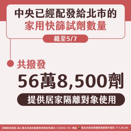 針對陳時中稱北市要了12萬劑快篩,中央要給73萬劑一事,黃珊珊說明,12.5萬劑快篩是北市府於5月4日申請,現在還沒有到貨,但這12.5萬劑是5月4日至5月8日的5天需求量,當天居家隔離人數是2.5萬人,這批到現在都還沒有到;中央5月6日發文說要給73萬500劑,且會分幾天配發,但目前也還沒到,中央撥付數量會全數用在公費採檢,不會運用在台北市政府機關內。