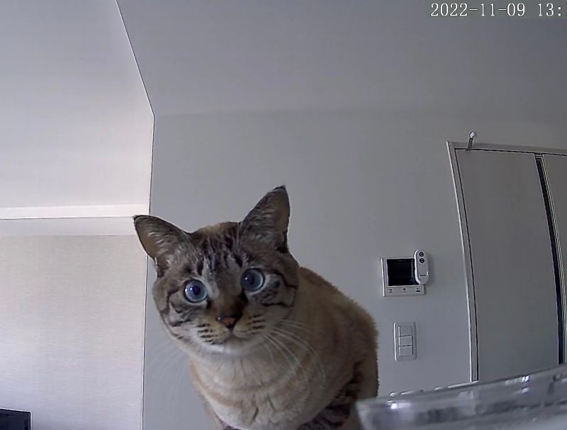 推主於9日發出兩張照片,表示當天出門時忘記幫愛貓補充零食,代表牠中午將沒有東西可吃,飼主緊張地打開寵物攝影機確認貓咪狀況,不料一打開就出現Mone的大頭,牠的一雙眼睛透過攝影機直視進飼主的內心,似乎在用眼神抗議自己被搞砸的午餐時間,飼主見此又好笑又抱歉,下班後立刻衝回家餵牠。