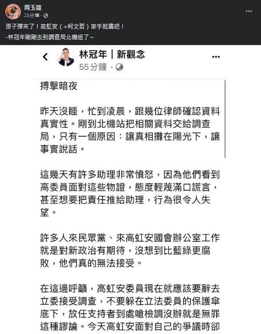 周玉蔻今日在臉書貼出林冠年臉書貼文截圖,直呼「原子彈來了!」並直接點名兩人,向他們喊道「高虹安(+柯文哲)束手就擒吧!」