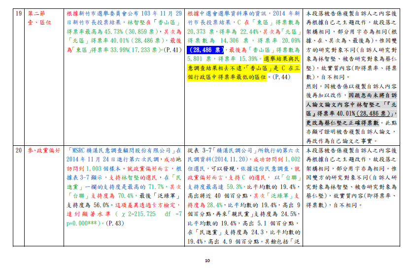 前新竹市長林智堅的台大國發所碩士在職專班論文抄襲,被抄襲的調查局幹員余正煌提起《著作權法》刑事自訴,台北地院今(11)日開庭,林智堅首度出庭,否認犯罪,但余正煌律師團列出論文33個段落高度近似,表格曝光。
