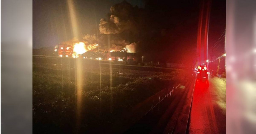桃園青埔鐵皮工廠陷火海無人員受傷受困殘火處理中。(消防局提供/呂筱蟬桃園傳真)