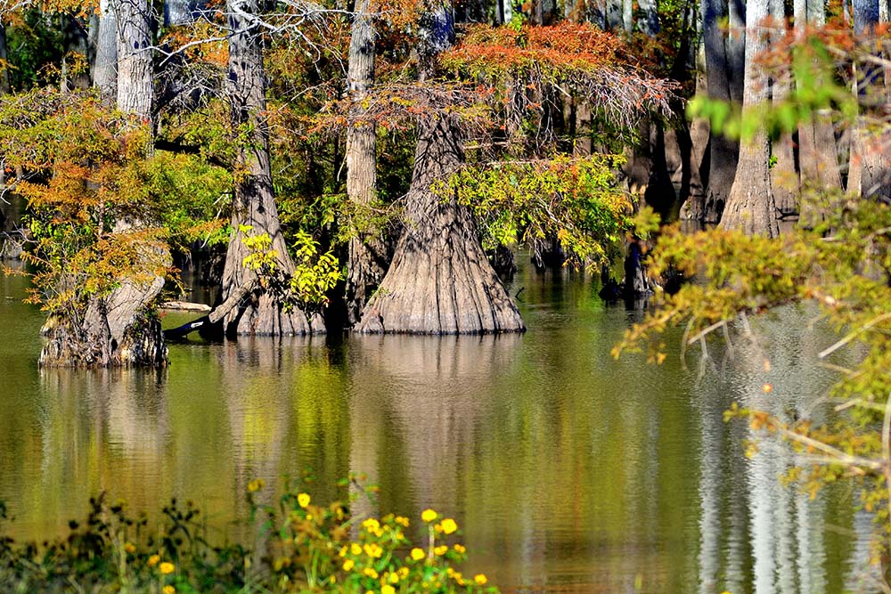 擁有全美國最大、被水淹沒的落羽松樹林之一,卡多湖受到為保護濕地而簽署的全球性政府間公約《拉薩姆公約》(Rasmar Convention)的保護,在這裡幾乎隨處可見濃密的落羽松隧道。