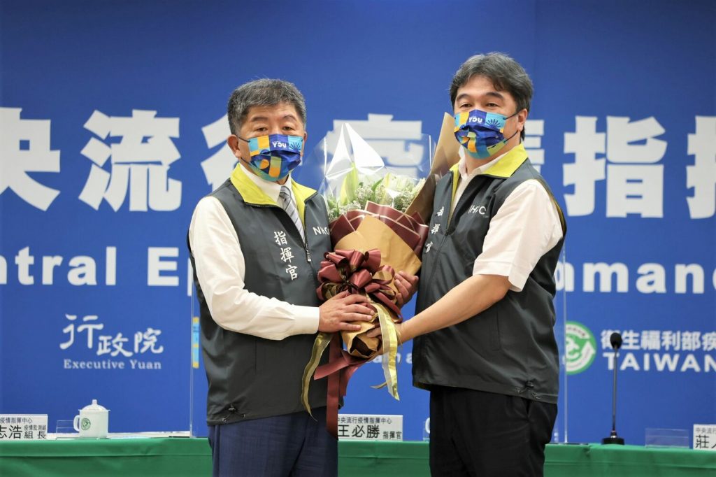 台北市長候選人陳時中(左)與衛福部長王必勝。 圖:中央流行疫情指揮中心提供