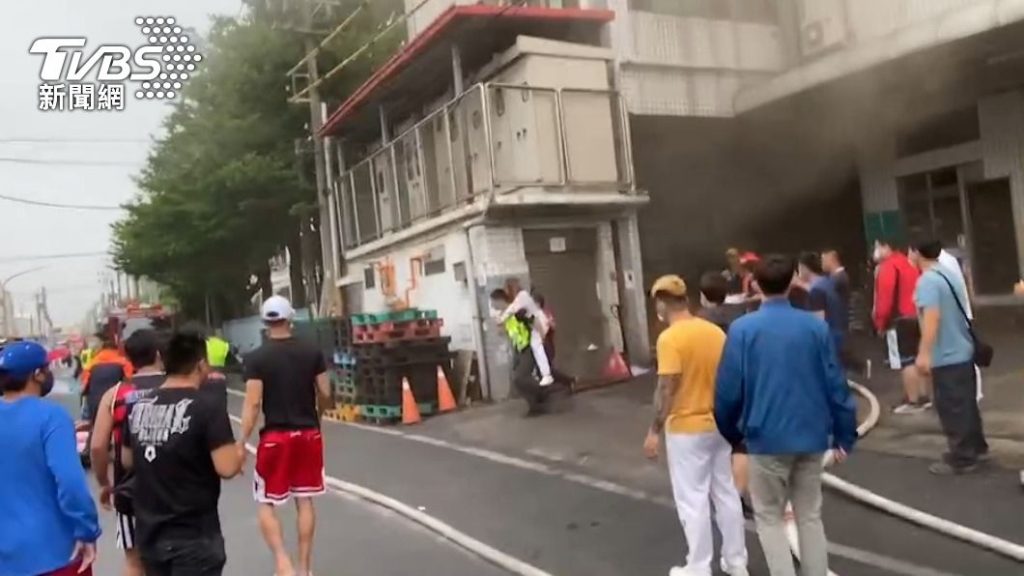 現場濃煙瀰漫,警消從火場背出員工。(圖/TVBS)