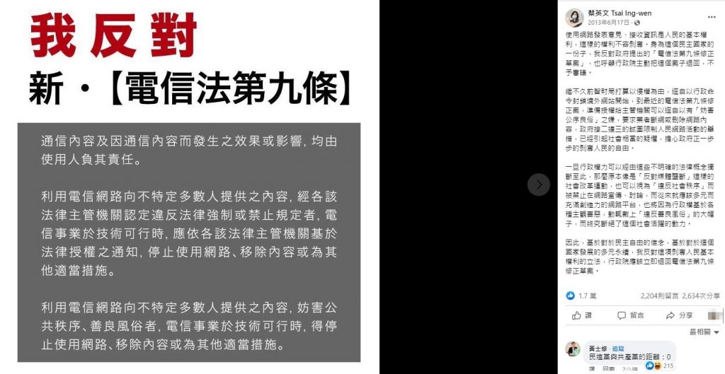 蔡英文2013年6月17日在臉書上公開表示,「我反對新『電信法第9條』」,使用網路發表意見、接收資訊是人民基本權利,這樣的權利不該被剝奪,所以請行政院主動將案子對回,不予審議。