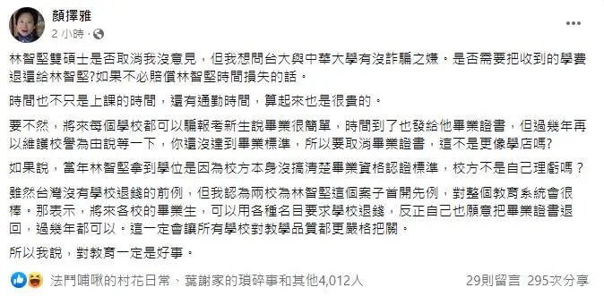 顏擇雅透過臉書表示,林智堅雙碩士是否取消她沒意見,但她想問「台大與中華大學有沒詐騙之嫌」。如果不必賠償林智堅時間損失的話,是否需要把收到的學費退還給林智堅?
