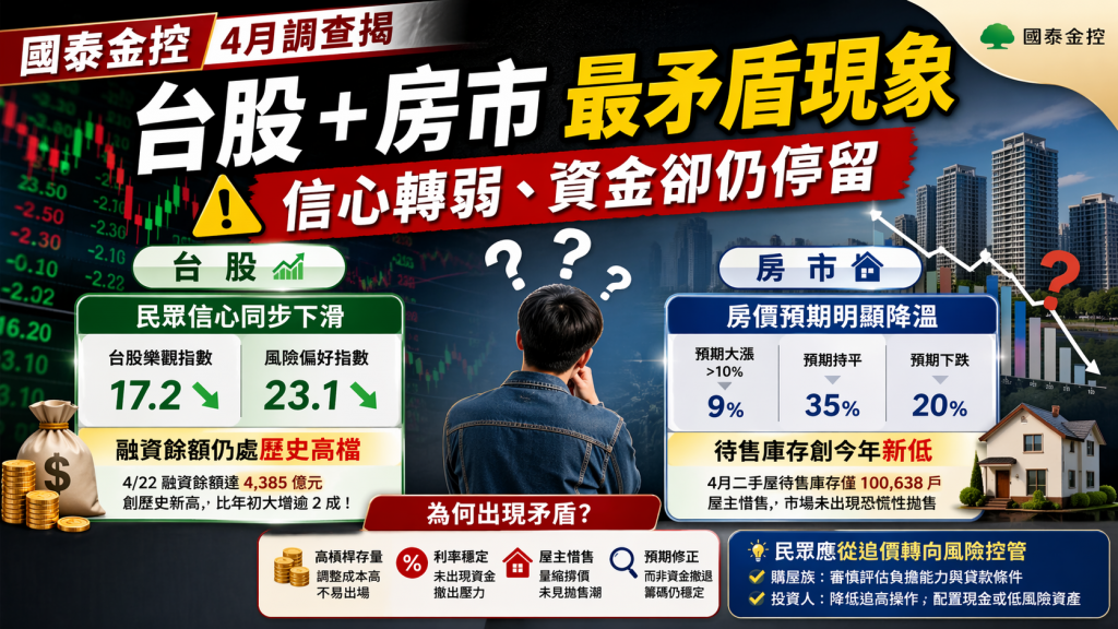 根據 國泰金控4月國民經濟信心調查 顯示,民眾對台股與房市的信心同步降溫,然而市場卻未出現恐慌性拋售,甚至部分槓桿指標仍維持高檔。