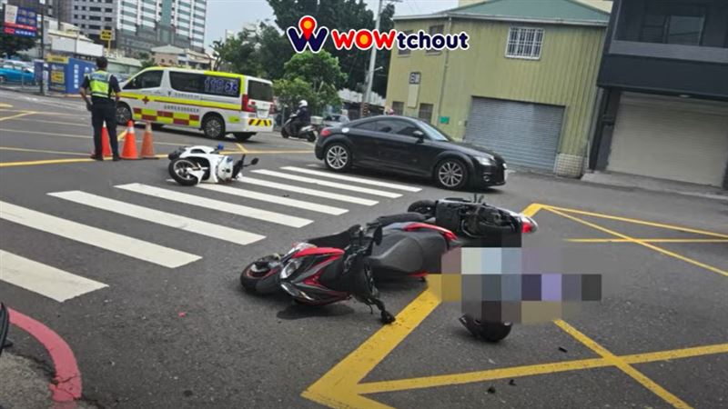 接著,又有另名女騎士從後方直接撞上,造成3輛機車在路口撞成一團,也嚇到路旁女行人,所幸,肇事騎士都只受輕傷。